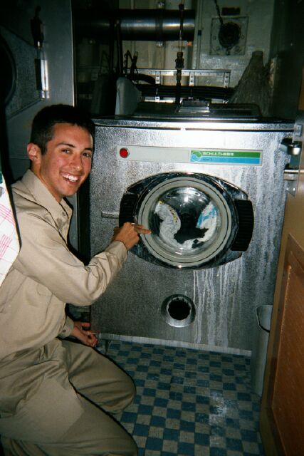 ![]() So after a week or so I went to go do my laundry. Inside, I found a spiffy German washer, complete with instructions in five languages (not Dutch, though!). Unfortunately, I couldn't open the washer's door. I asked someone how, and they pointed out the "secret button" underneath the washer (where my left hand is in the picture). Usually the Germans have good design, but this particular German washer is not winning high marks in the "good visual affordance cues" department! ![]() Luke's Guide to Design: Part Two While the Germans let me down, the Belgians seem to have their act together in the design department. Here I'm leaning against a color-coded eductor. For you non-military or firefighting types, an eductor is a fancy hunk of metal that allows one to pump water out of somewhere (such as, for example, your rapidly sinking ship) using a fire main and Bernoulli's principle. By color coding all the fittings, the Belgians have made it easy to set up the eductor, especially in the middle of a "casualty" (i.e. lots of stuff going wrong at once). | ||||||||||
